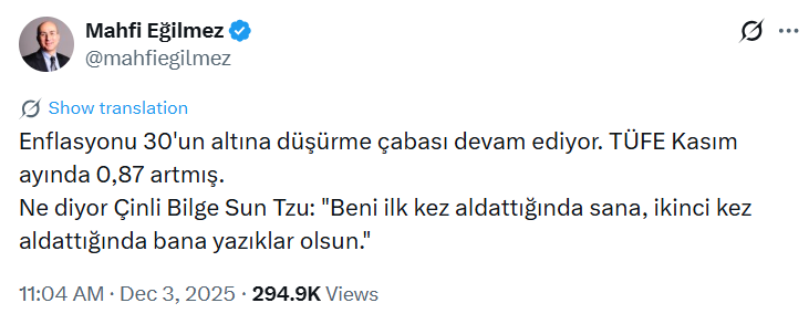 Ekonomist Mahfi Eğilmez, enflasyon rakamlarına ilişkin değerlendirmesinde klasik ekonomi yorumlarının ötesine geçerek Sun Tzu’nun Savaş Sanatı eserinden bir pasajı hatırlattı. “Enflasyonu 30’un altına düşürme çabası devam ediyor. TÜFE Kasım ayında 0,87 artmış” diyen Eğilmez, ardından Çinli düşünürün sözünü aktararak, “Ne diyor Çinli Bilge Sun Tzu: ‘Beni ilk kez aldattığında sana, ikinci kez aldattığında bana yazıklar olsun’” ifadelerini kullandı.